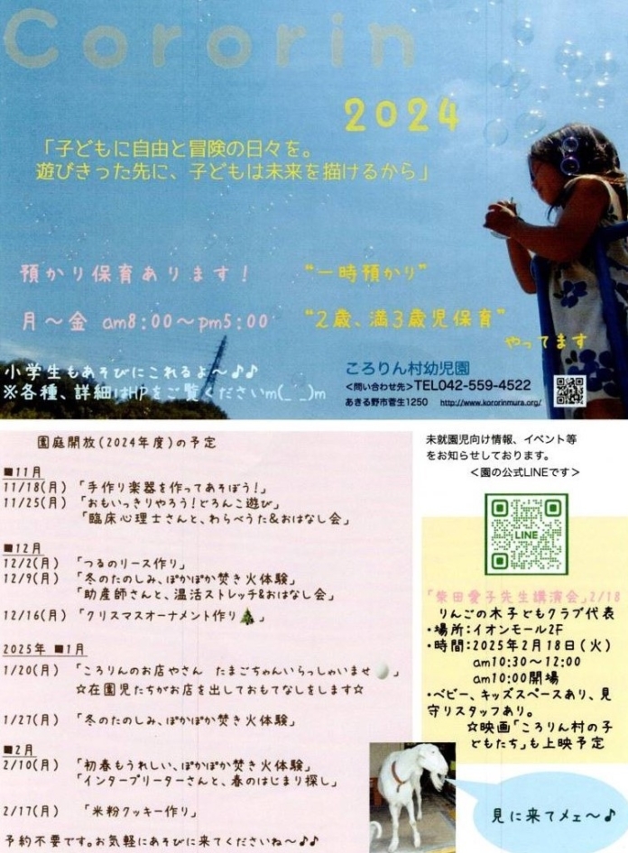 通常保育を行っている時間帯に園に来ていただいて、普段の様子を実際に体験ができます。在園児と一緒に普段のころりんで遊びましょう~!