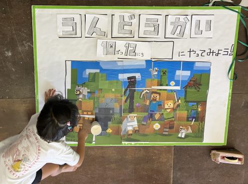 A「これ パズルになってるんじゃない?!」とダンボール紙に大きなパーツをつなげていきます! やったぁ!できたー!!! マイクラのキャラクターがたくさんいるパズルが完成!!ん?!なんだろー?と考えているとドン!ドン!!と音と共に敵のお面を付けたげんきんが出現! ビクッと驚くとすぐにツルハシで戦います(笑)。すると敵がまたパーツをおとしていき… そのパーツには文字が書いてありました! 名探偵きじさんニヤリッ! 並べたらいいんだよ!!とパーツを並べてみます!「マイクラじゃない?」カクカク文字のをよみまちがえたり、「“うどんかい“じゃない?」「いや、”いかうどん“だよ!と笑い合いながら並べていると…。